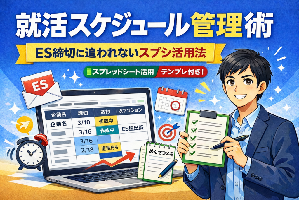 就活は長期戦。だからこそ、頑張り方だけではなく「回し方」も大事です。スプシ1枚で、締切も進捗も次の一手も見える化できます。